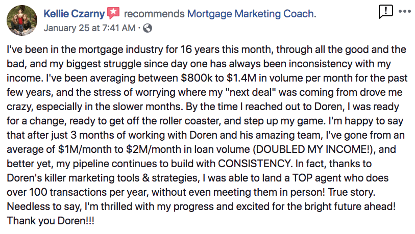 Doren and his team are a cut above in terms of service, support, and overall excellence. If one is truly committed to taking their mortgage business to the next level, you need to check out the Mortgage Marketing Coach and Doren's team.