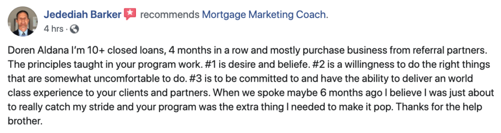 Doren Aldana – I’ve closed 10+ loans per month, 4 months in a row and mostly purchase business from referral partners. The principles taught in your program work. #1 is desire and belief. #2 is willingness to do the right things that are somewhat uncomfortable to do. #3 is to be committed and have the ability to deliver a world class experience to your clients and partners. When we spoke maybe 6 months ago, I believe I was just about to really catch my stride and your program was the extra thing I needed to make it pop. Thanks for the help brother!
