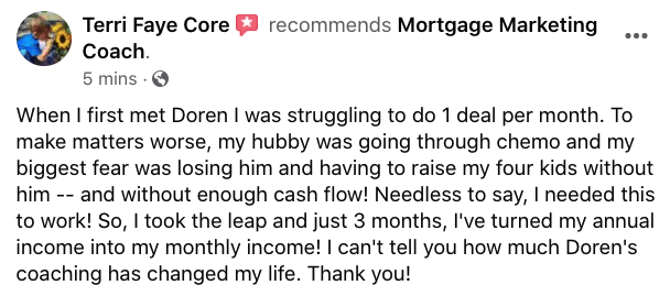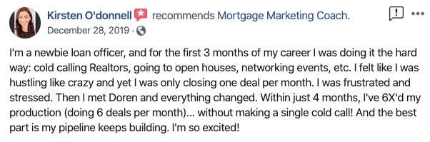 I’m a newbie loan officer, and for the first 3 months of my career I was doing it the hard way: cold calling Realtors, going to open houses, networking events, etc. I felt like I was hustling like crazy and yet I was only closing one deal per month. I was frustrated and stressed. Then I met Doren and everything changed. Within just 4 months, I’ve 6X’d my production (doing 6 deals per month)… without making a single cold call! And the best part is my pipeline keeps building. I’m so excited!