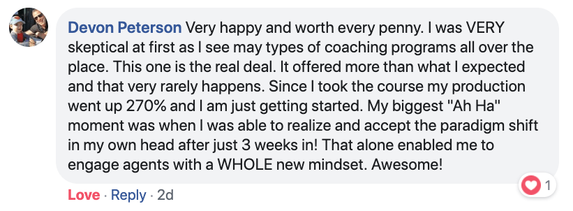 simply put, Doren’s program is a game changer. I have only implemented about 1/2 of what I have learned so far and in only 45 days have 460 total leads with an amazing 57% response rate, 30+ new applications and more on the way. Once implementing the entire program, we should technically be unstoppable! Great support, tools, systems, and overall experience is 5 out of 5+++