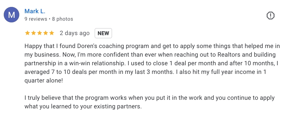 Happy that I found Doren's coaching program and get to apply some things that helped me in my business. Now, I'm more confident than ever when reaching out to Realtors and building partnership in a win-win relationship. I used to close 1 deal per month and after 10 months, I averaged 7 to 10 deals per month in my last 3 months. I also hit my full year income in 1 quarter alone!